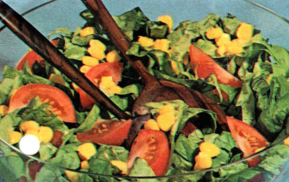 skål grøn salat blandet med ærter, tomatbåde og persille i