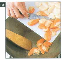 2. Skær hver kammusling i 3-4 stykker, og korallerne halveres,