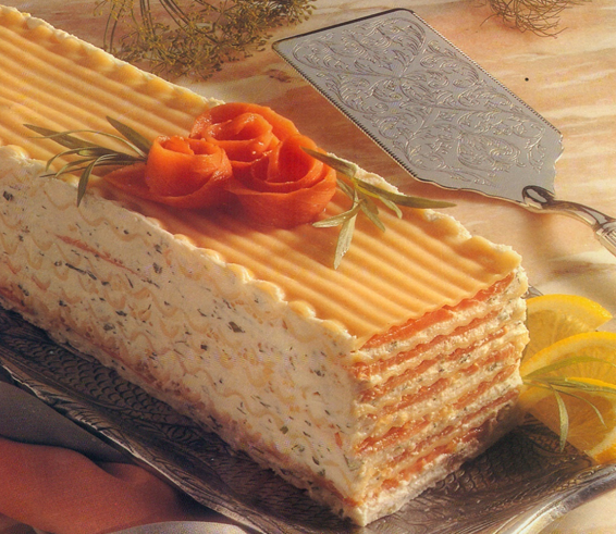 6. Pynt med resten af laksen, som rulles så de ligner roser og frisk estragon hvis det ønskes. Skæres i skiver med en varm kniv.