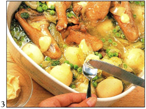 Anden er skåret i 10 portionsstykker og stegt i ovnen, hvor der tilsættes små kartoffelstykker og på slutningen ærter. Det smager dejligt året rundt - se opskrift her