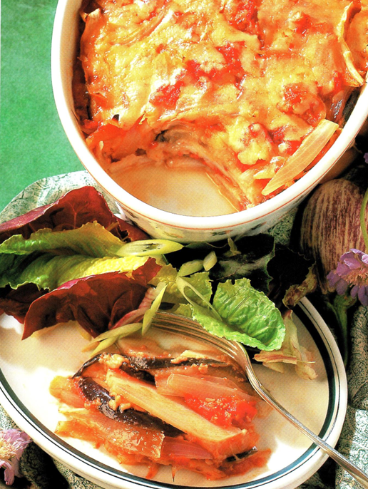 En lækker vegetarret med aubergine og kartofler vendt i en smagfuld tomatsauce. Hele herligheden toppes med frisk cheddarost og bages i ovnen.