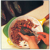 4. Fyld forsigtigt 35 g picadillo fyld i hver chili med en ske; pres chilierne fast mellem hænderne for at fjerne luften og for at lukke dem.