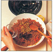 Picadillo fyld: Trin 2: Rør krydderierne op i oksekødsblandingen.