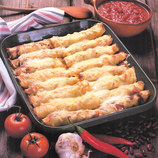 INFO: En enchilada er en tortilla rullet rundt om en fyldning og dækket med en velsmagende sauce. Enchiladas kan fyldes med forskellige ingredienser, herunder kød, ost, bønner, kartofler, grønsager eller kombinationer.