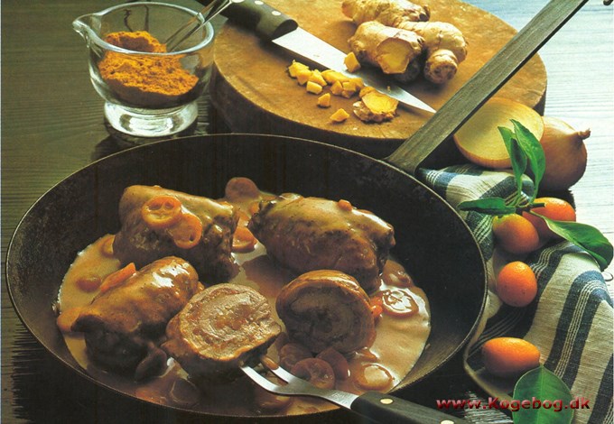 Ingefærrouladerne ligger i en dejlig sauce. Fin gæstemiddag fx med hjemmelavet is bagefter.