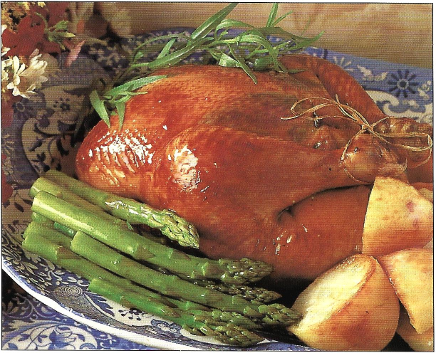 5. Fjern snoren, og server kyllingen på et fad, fx med grønne asparges.