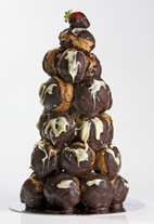 INFO: En croquembouche eller croque-en-bouche er en fransk dessert bestående af choux wienerbrødskugler stablet i en kegle og bundet med tråde af karamel. I Italien og Frankrig serveres det ofte ved bryllupper, dåb og første kommunion.