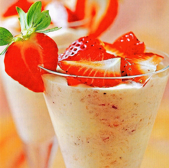 Her får du jordbærdessert i flere spændende udgaver. Vælg mellem creme med amarula, med cremefraiche, med vanilje eller som hindbærcreme. Lækkert.