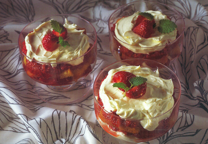 5. Anret i portionsskåle lagvis ostecreme, skivede jordbær,