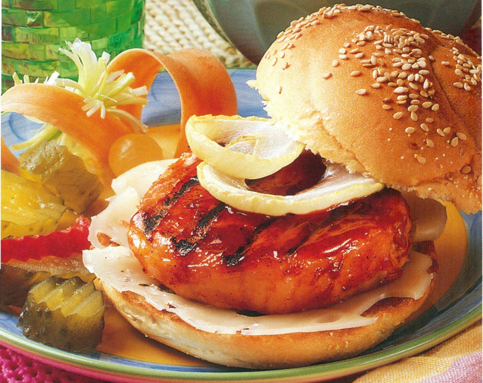 Mager grillet svinekotelet med løgringe er en velsmagende afveksling til den sædvanlige hamburger.
