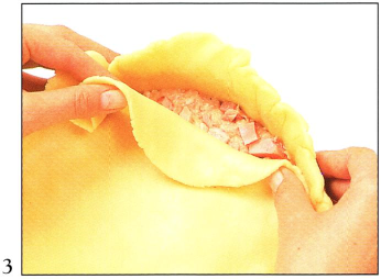 2. Fyld: Kom kød, krydderurter, æg, løg, citronskal, sennep