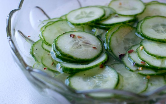 3. Lad agurkeskiverne træk­ke i marinaden i mindst et kvarter.