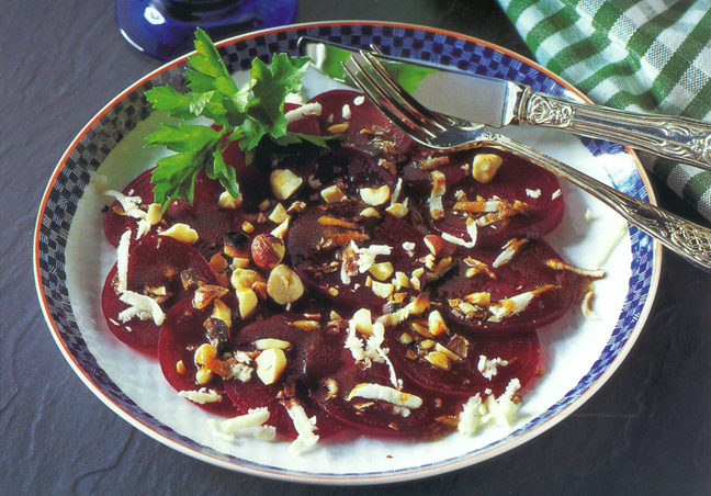 Carpaccio (tyndt skårede, rå skiver af kød eller laks i en vinaigrettesauce) kan meget vel tilberedes også på fine grønsager. Her en umådeligt vellykket variant med rødbeder.