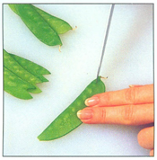 2. For at fjerne stilken fra ærterne dekorativt, knibes stilken fra hver bælg, træk strengen af hvis den er der. (Unge bælge har måske ikke strengen).