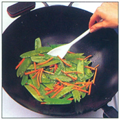 Trin 4: Lynsteg ærte- og gulerodsblandingen i wokken.