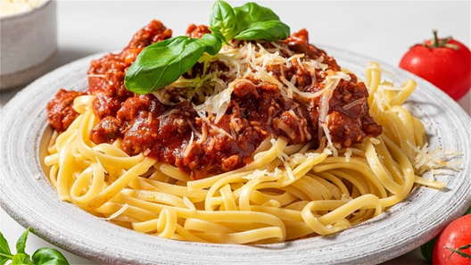 Tilbered denne utrolige spaghetti bolognese, startende med friskhakket kød, løg, tomatpuré, paprika med et strejf rødvin samt spaghetti og parmesanost.