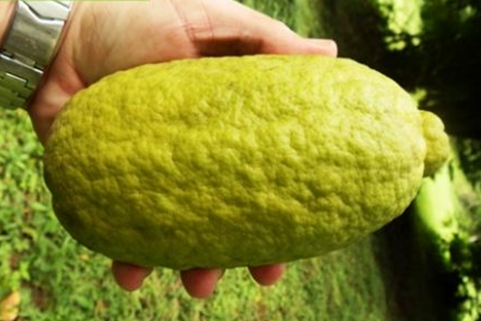 citronen, med en vægt på 1-2 kilo. Skallen er tyk og grov.