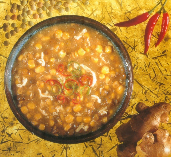 Denne lyse suppe tilberedes af majs og grønne linser, og den ligner den traditionelle krabbesuppe med majs.