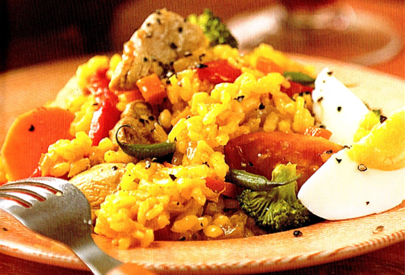 Paella med rest af kylling eller svinekød, samt æg, tomater, grønsager, paprika og paella ris.
