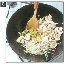 6. Tilsæt svampe og bønnespirer og svits under omrøring i yderligere 2 min.