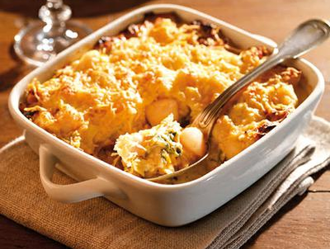 6. Drys gratinen med rasp, læg et par smørklatter over og bag på ovnens nederste rille i ca 40 min.