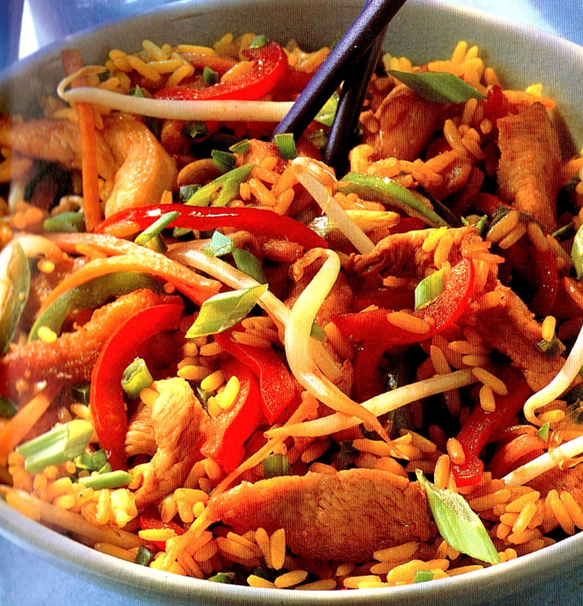 Den bedste opskrift på virkelig lækker kylling i wok med ris og dejlige grønsager. Hele retten laves i gryde og wok, og er let og hurtig at lave.