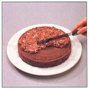 For at samle kagen, lægges et kagelag på et kagefad; fordel kakao-nødde fyld over.