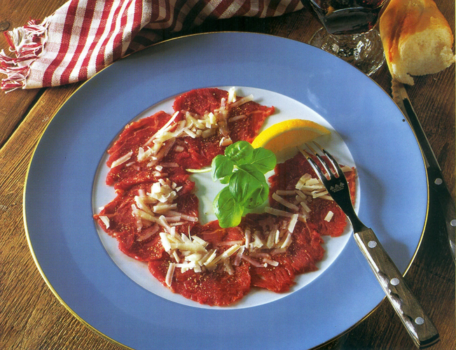 Tyndt skårne skiver af oksefilet, som marineres i olie, hvis det skal være en ægte italiensk carpaccio.