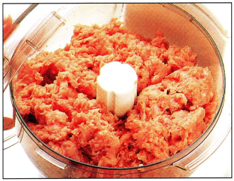 Mens risene er i ovnen, hakkes kyllingekødet fint i en foodprocessor.