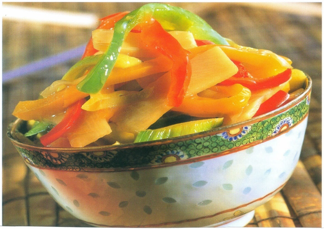 En ret med en vidunderlig stærk smag af ingefær, som er typisk for kinesisk madlavning. De blandede peberfrugter gør den til en farvesymfoni.