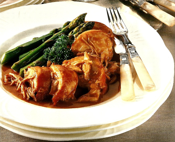 Serveres på varme tallerkener, pyntet med persille.