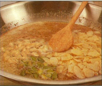 Kom mandler, pistacier og pinjekerner i og vend dem i det karamelliserede sukker.