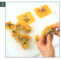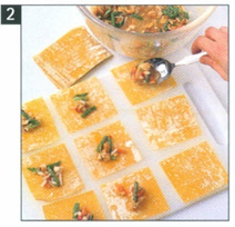 2. Læg wontondejpladerne ud på køkkenbordet og fordel fyldet midt på hver af dem.