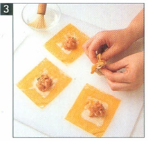 2. Læg en lille skefuld af fyldet på hver wontondejplade.