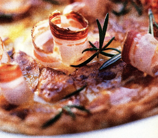 Læg halvdelen af pancetta'en på toppen og sæt panden i ovnen igen i 2 min.