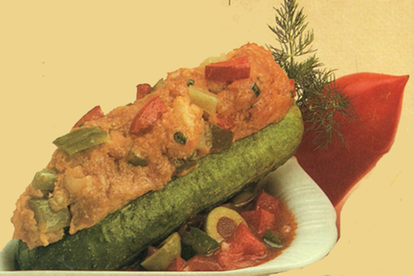 Fordel saucen i et ovnfast fad og stil de fyldte drueagurker i.