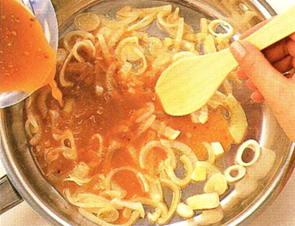 Kom løgene i gryden og steg dem i 2-3 min ved medium varme,