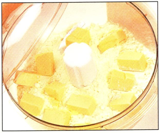 Kom smørret i melet. Hvis man har en pulseknap på sin køkkenmaskine, bruges den