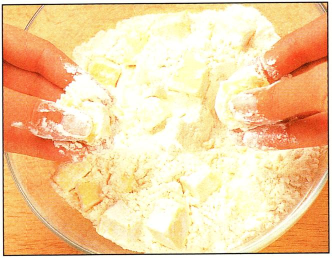 Når smørret gnides ind i melet, bruges kun fingerspidserne,