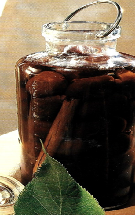 Eddiken og krydderierne koges op med sukkeret to gange og hældes over sveskeblommerne.