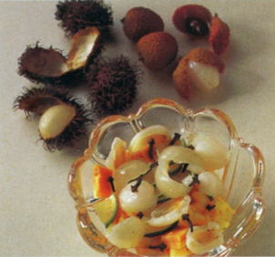 Litchi og rambutan. Begge frugter skrælles og udkernes. Laven krydret sukkerlage med nellike eller ingefær og læg frugterne i. Godt til is eller tærter!