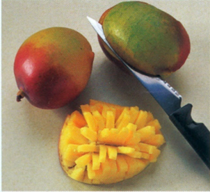 Mango. Til dessert gør du sådan: Skræl frugten og skær både ud mod stenen. Eller lav et mangopindsvin. Skær to halve ind mod stenen. Snit frugtkødet, tryk skallen ind og fold ud.