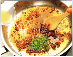 Steg hvidløg og chili i 2 min under konstant omrøring.