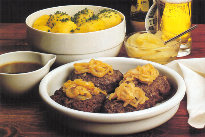 6. Server bøfferne på fadet. Læg løgene over og server skysaucen til.