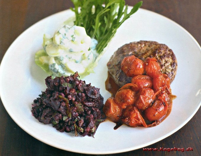 INFO: Hakkebøf er en traditionel dansk ret. Den består af hakket oksekød stegt på panden og spises normalt med bløde løg, kogte kartofler og brun sauce. Tilbehøret kan være surt og sødt som syltede agurker, syltede rødbeder, rødkål og syltetøj
