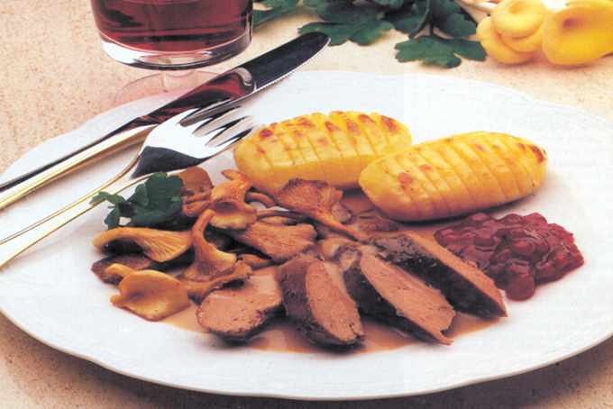 Tyttebær, ribs- eller rønnebærgelé og Hasselbackkartofler og Champignon, smørsauterede kan serveres til.