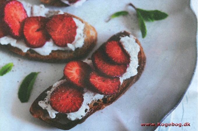 2. Smør med gedeost og top med jordbær skåret i skiver.