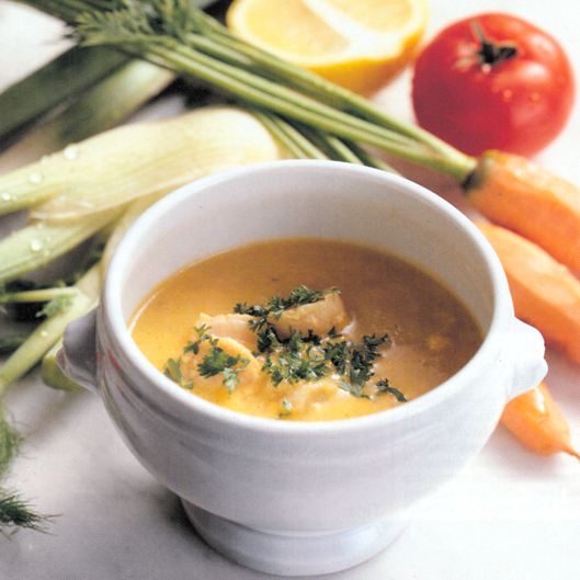 Spæd med bouillonen og lad fiskesuppen koge ind uden låg for