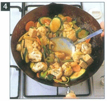 2. Rør vandkastanjer, tofu, bouillon, salt, farin, sojasauce og sherry i og bring det i kog.