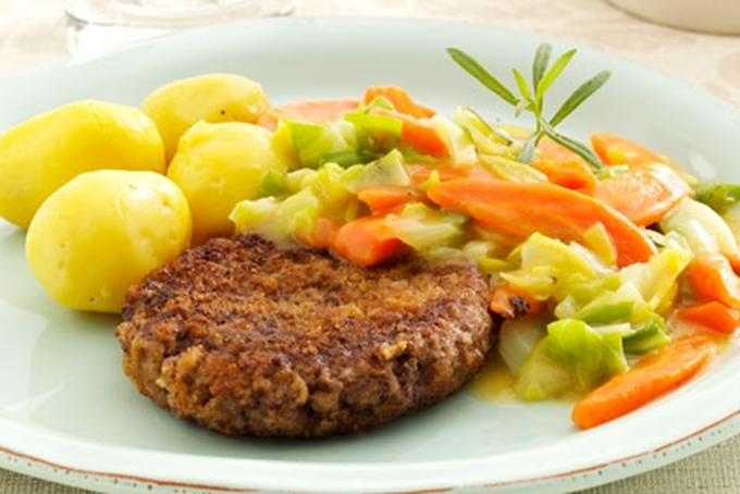 Vend kun krebinetterne en gang under stegningen, så bevares paneringen bedst. Hakkekødet kan drøjes med 1 kogt, melet kartoffel.